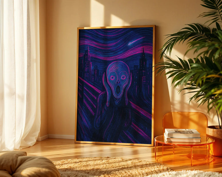Dieses alte Plakat mit futuristischem Schrei interpretiert ein Meisterwerk des Expressionismus mit einer beispiellosen visuellen Intensität neu. Durch intensive Neonfarben und eine stilisierte urbane Kulisse verkörpert dieses Werk das innere Chaos in einer technologischen Welt.