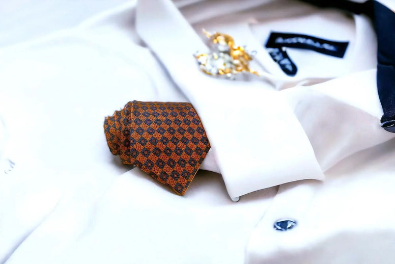 - Cravate Soie souple et douce teintée ocre à damier bleu