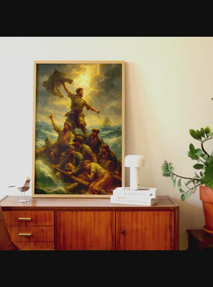⚓ Cette affiche histoire ancienne incarne la lutte humaine contre la nature déchaînée, l’instinct de survie et l’appel du salut. Chaque vague, chaque rayon de lumière, chaque regard tendu vers l’horizon renforce la portée dramatique de cette Peinture radeau de la méduse, idéale pour les passionnés d’épopées historiques et de récits de bravoure.